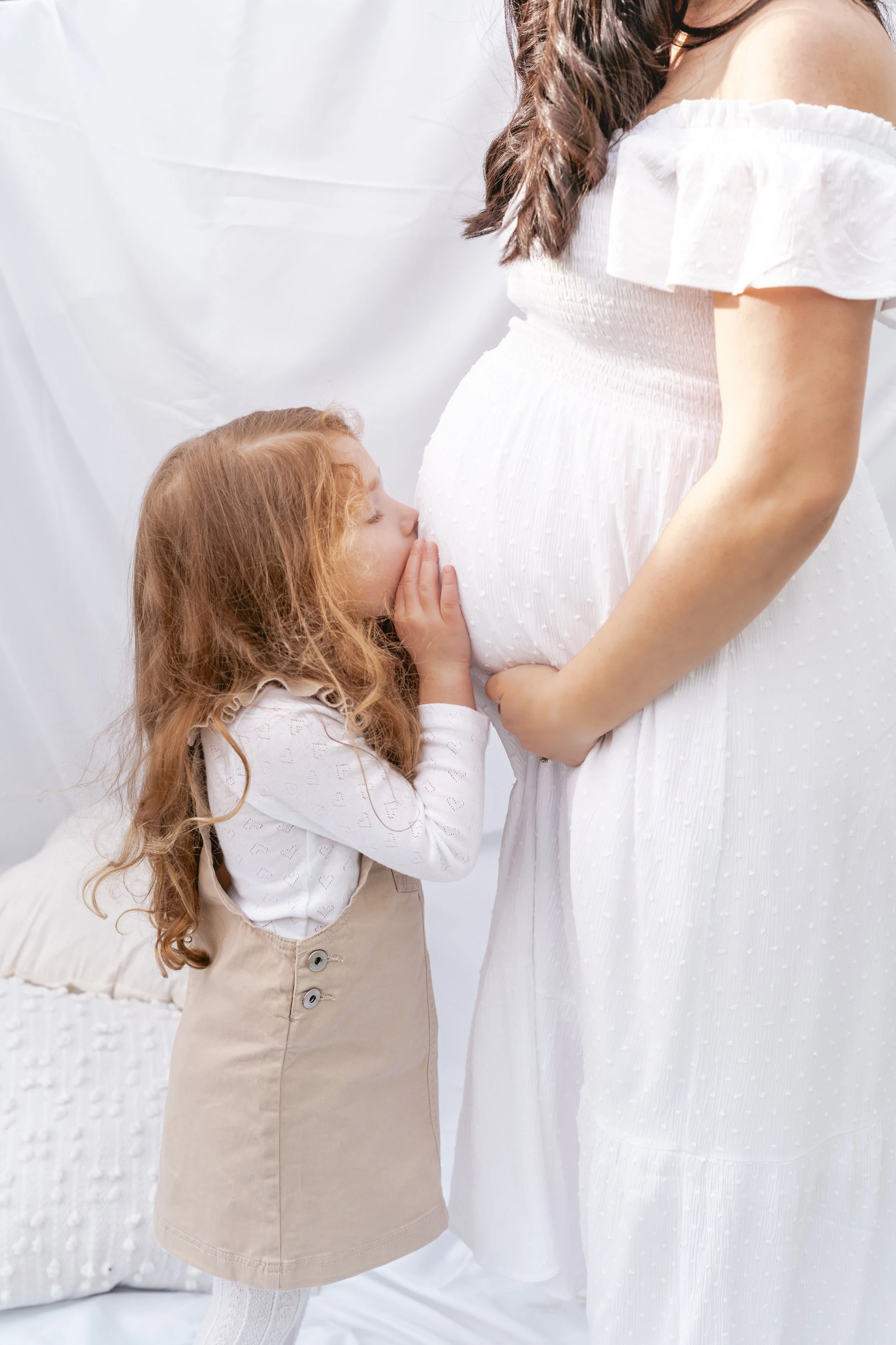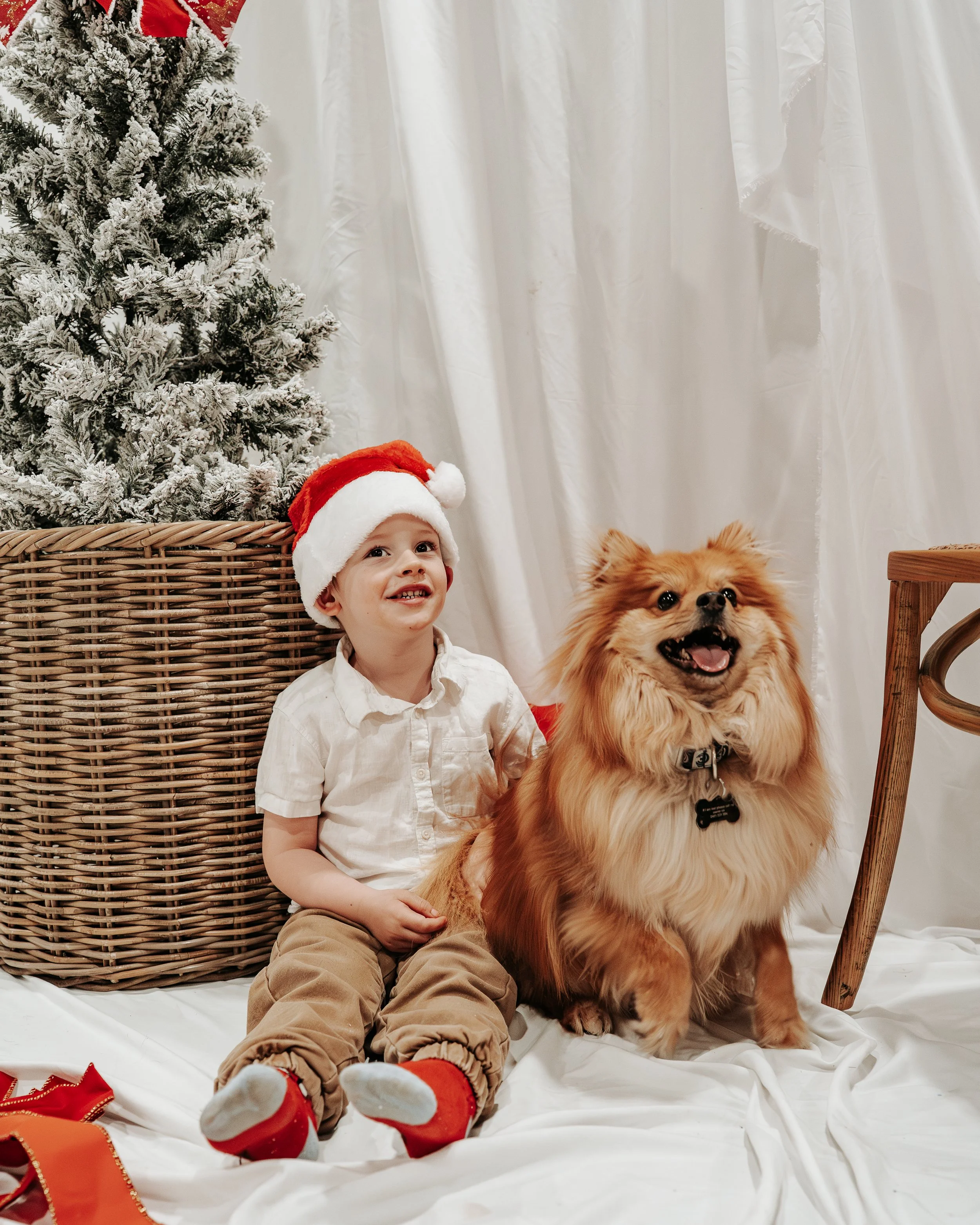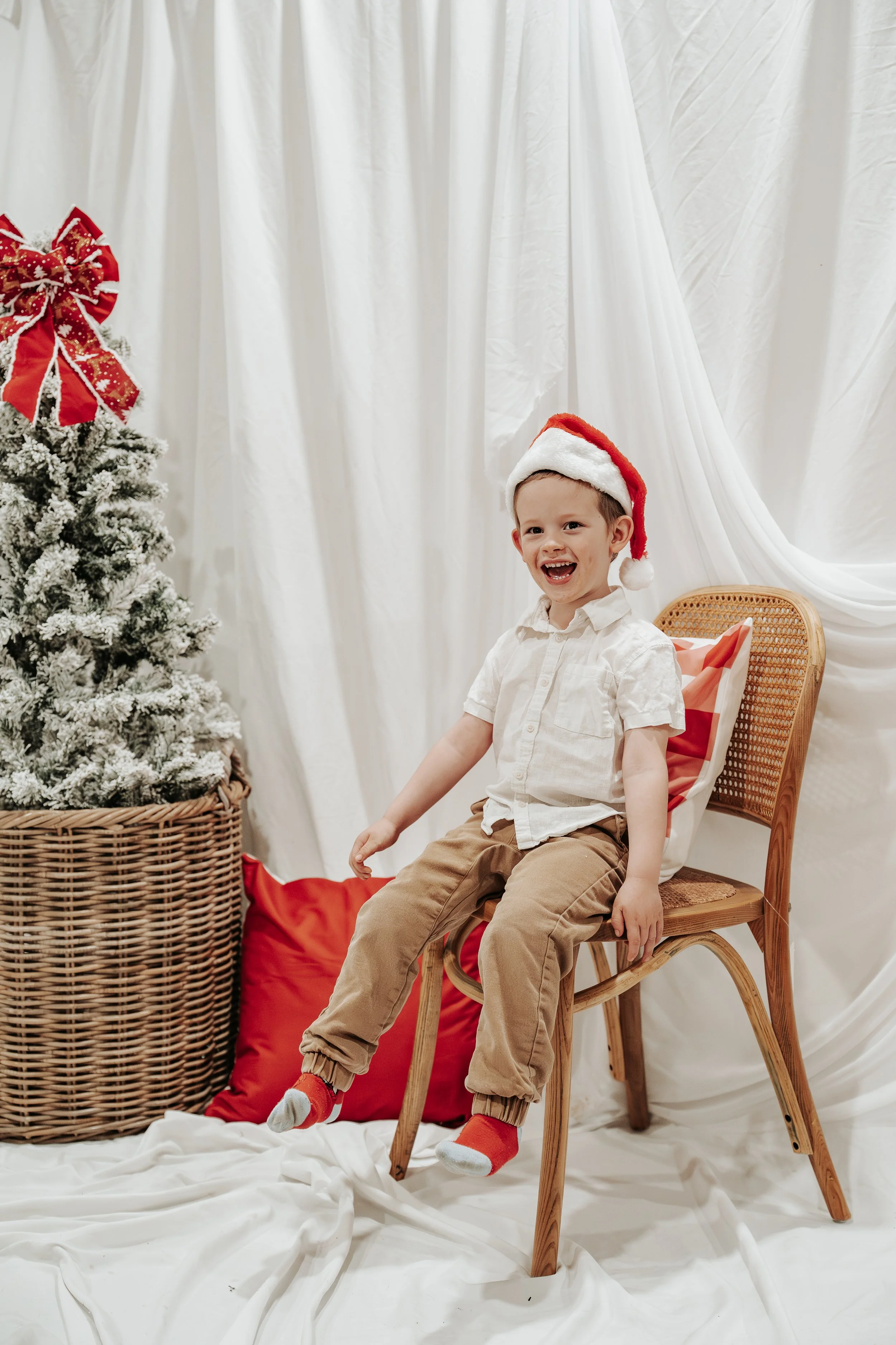 This year’s set is simple, cozy, and filled with Christmas cheer! Think frosted pine tree with a big red bow, woven basket base for that homely touch & soft white draped backdrop. Add in some comfy cushions, a natural timber chair, and of course your little ones (or furry friends 🐶) and you’ve got the perfect recipe for timeless Christmas memories.